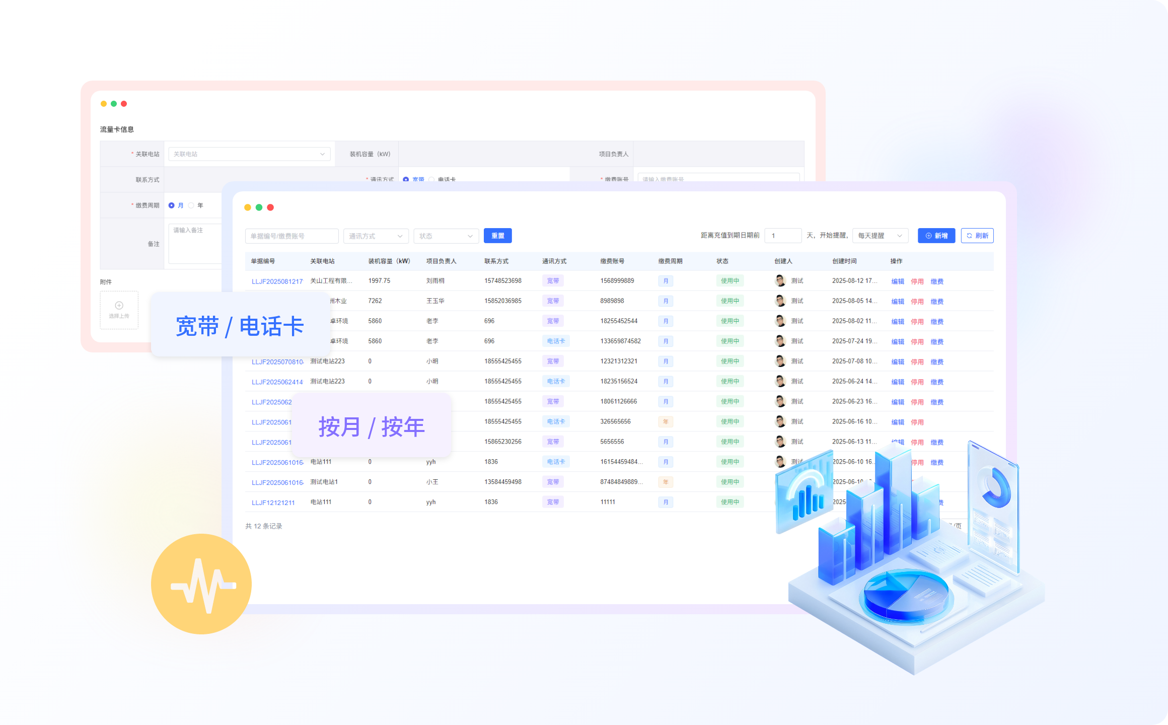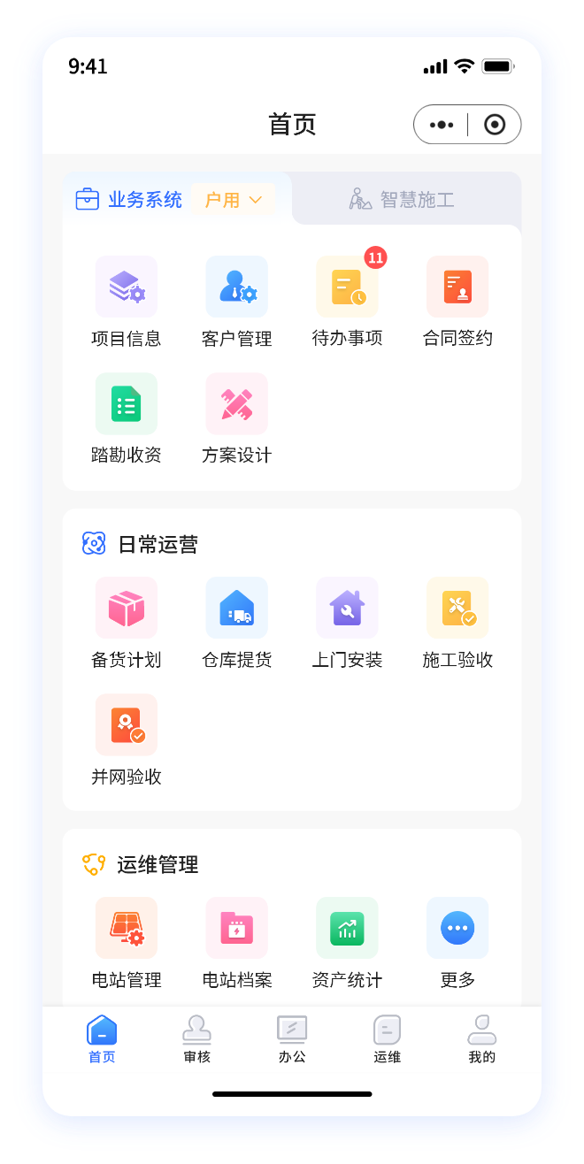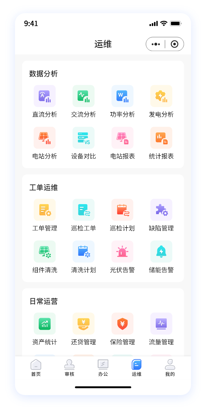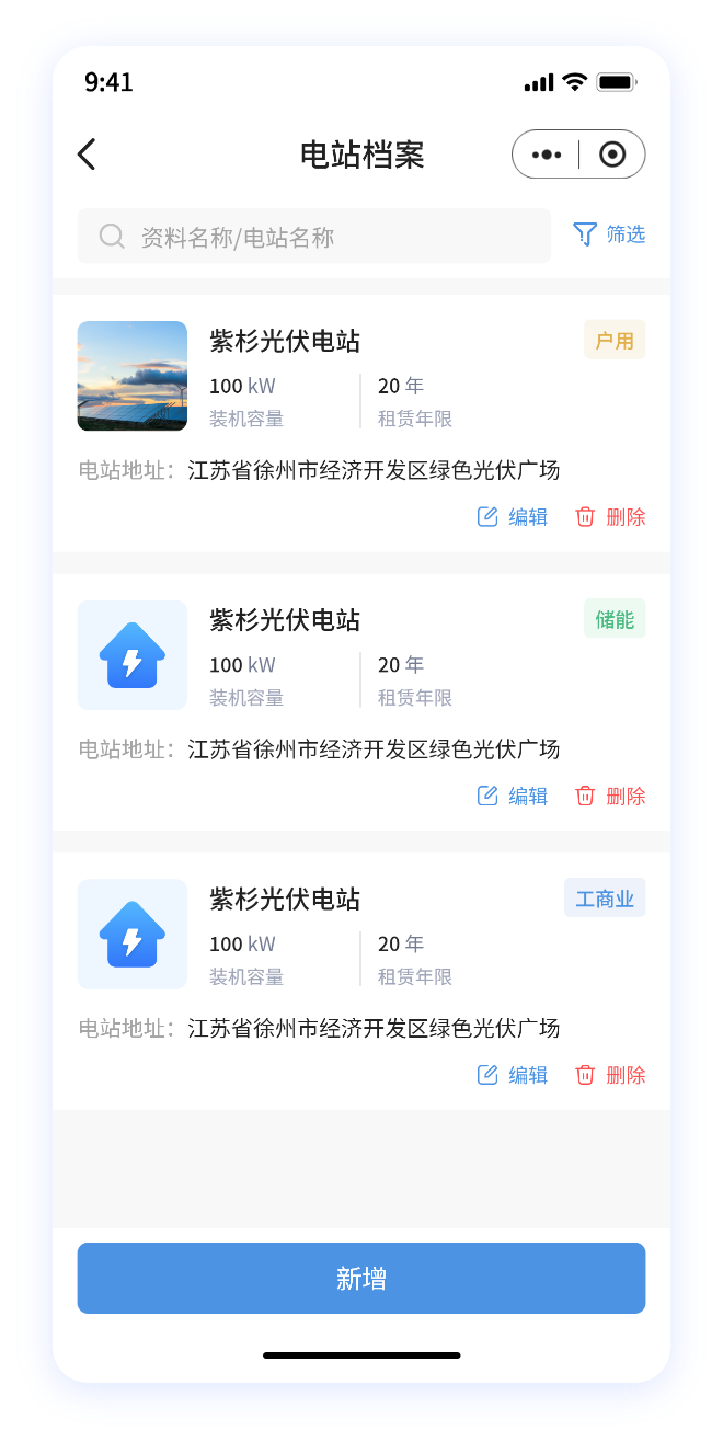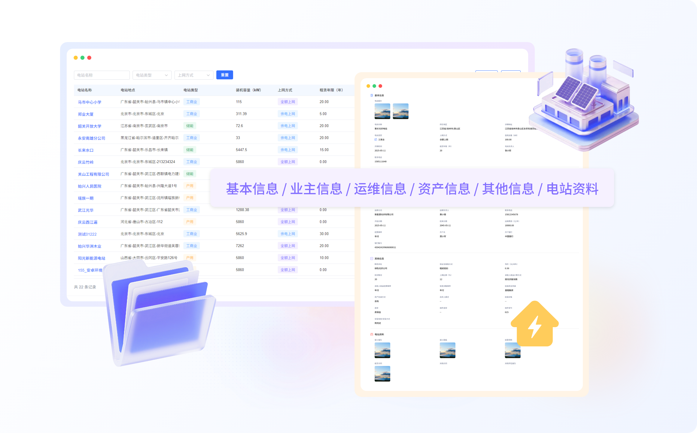 可对电站档案/还贷计划/租金结算/流量卡/电费缴纳/合同管理日常管理